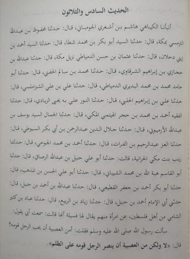 Telah menceritakan kepada kami [Ziyad bin Rabi’] berkata: telah menceritakan kepada kami [‘Abbad bin Katsir asy-Syami] dari seorang penduduk Palestina dari salah seorang dari mereka, yang bernama [Fasilah] sesungguhnya dia berkata: saya telah mendengar [bapakku] berkata: saya telah bertanya kepada Rasulullah Shallallahu’alaihiwasallam, lalu saya berkata: “Wahai Rasulullah, apakah termasuk dari fanatik golongan, jika seseorang menyukai kaumnya?” Beliau bersabda: “Tidak, tapi yang termasuk fanatik adalah seorang laki-laki menolong kaumnya padahal dia melakukan penganiayaan.”